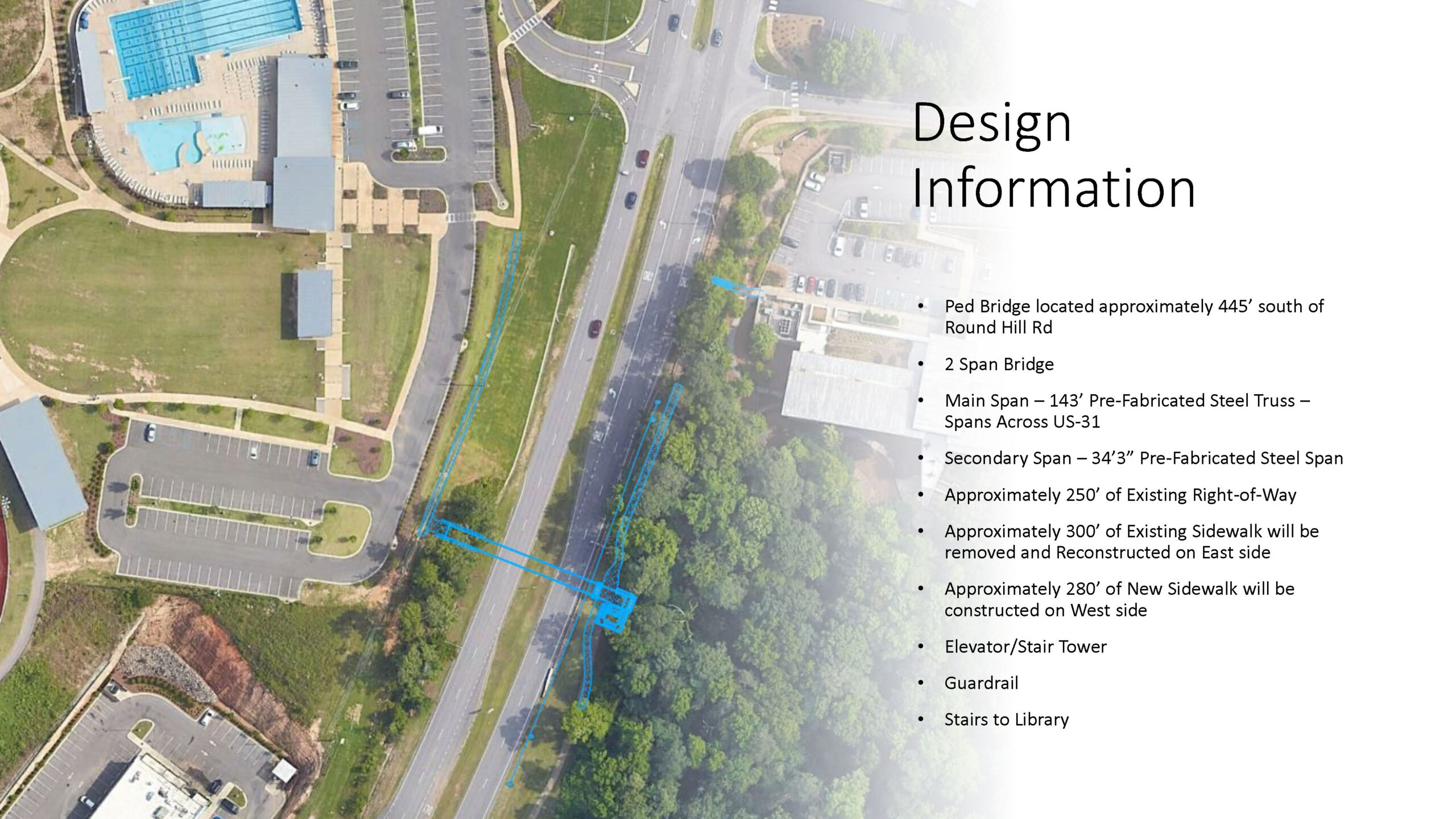 Pedestrian Bridge – A pedestrian bridge is planned to span across Highway 31 in the vicinity of Wald Park and the Vestavia Hills Library in the Forest. The purpose of the project is to provide a link to the existing sidewalk system that connects the City’s schools, libraries, parks and other features/amenities, and to improve the overall mobility and safety of pedestrians crossing Highway 31. This is partially a federally funded project, administered by the Alabama Department of Transportation. A 20% match of City funds has been used for the design and construction of the project. Construction began in August 2024 and is currently tracking for a 1st quarter 2026 completion. Click to view design rendering #1 and design rendering #2, as well as the design information and location.